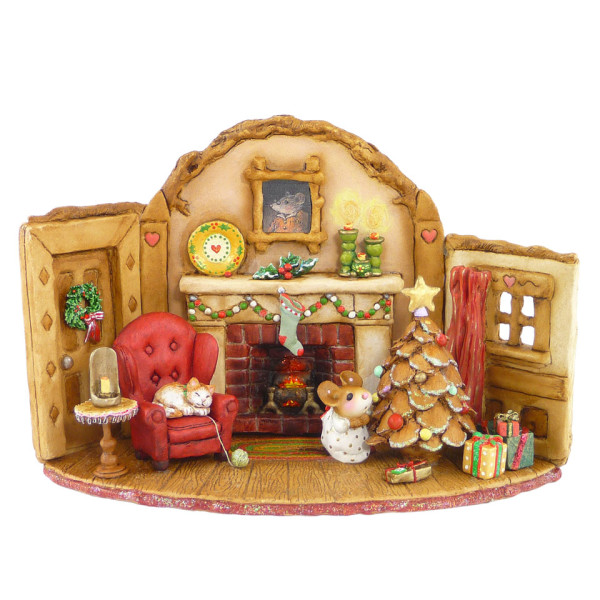 Sculpted by Donna, this wonderfully cozy Christmas scene is full of tiny holiday details. A sweet mouse decorates her pine cone tree as her little kitty takes a catnap nearby. Can’t we all just live in there too?! So sweet! 3.75″ x 5.75″ x 2.875″