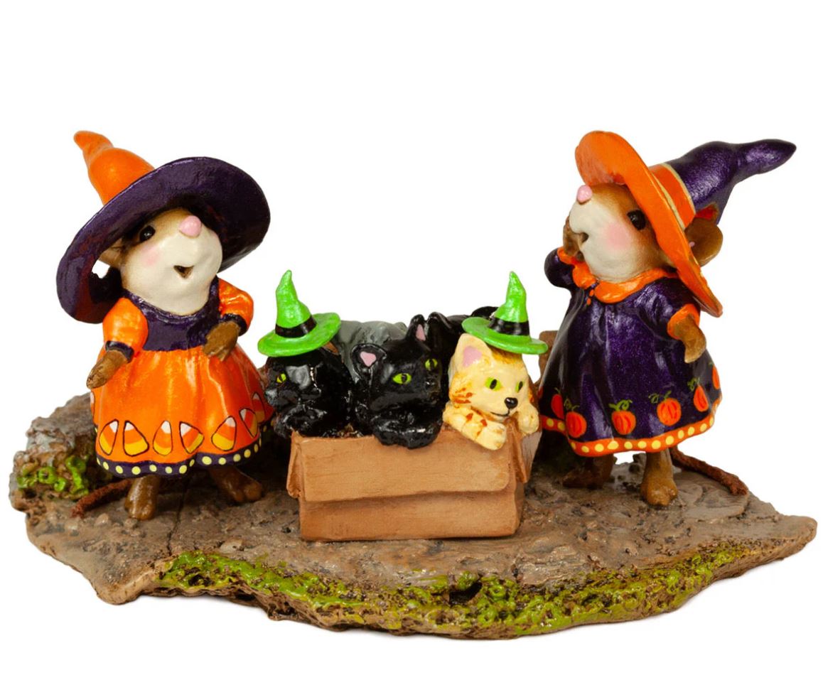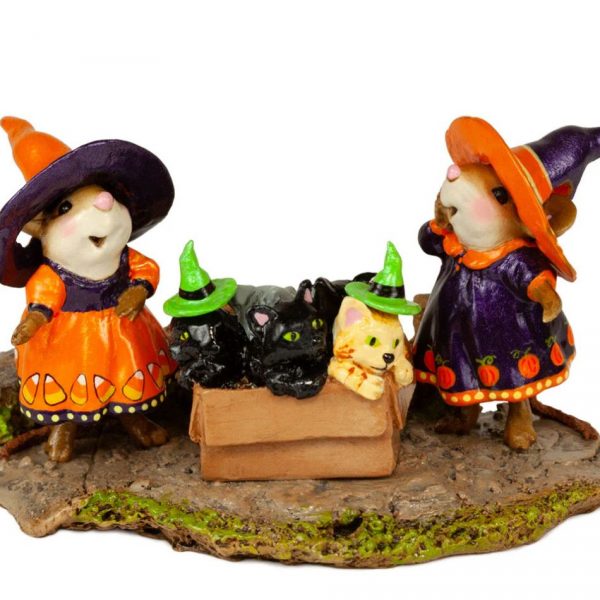 Little Halloween witches dressed in their cutest attire happen upon a box of kittens which has absolutely made their day! Look closely to see the tiny hand painted details on their skirts.