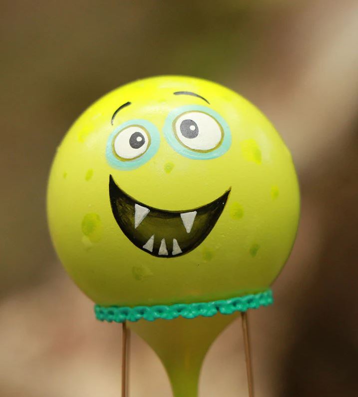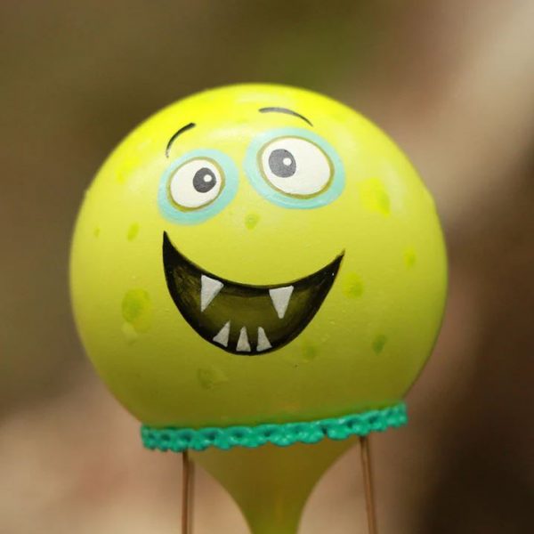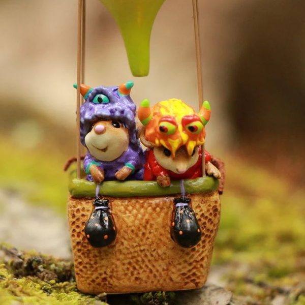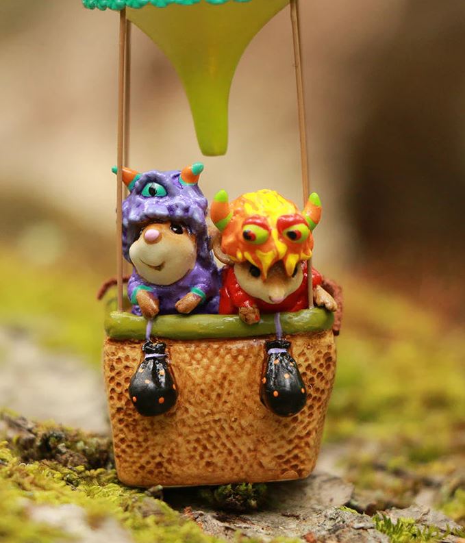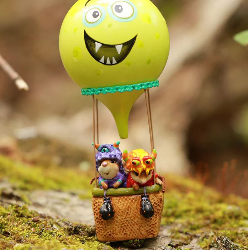 Two little monsters are in flight on a hot air balloon ride that will give you a fright! A silly monster face that smiles like the man in the moon is taking them for their ride.