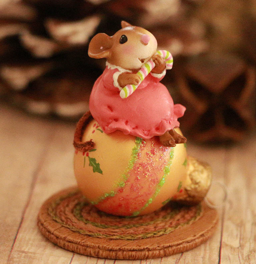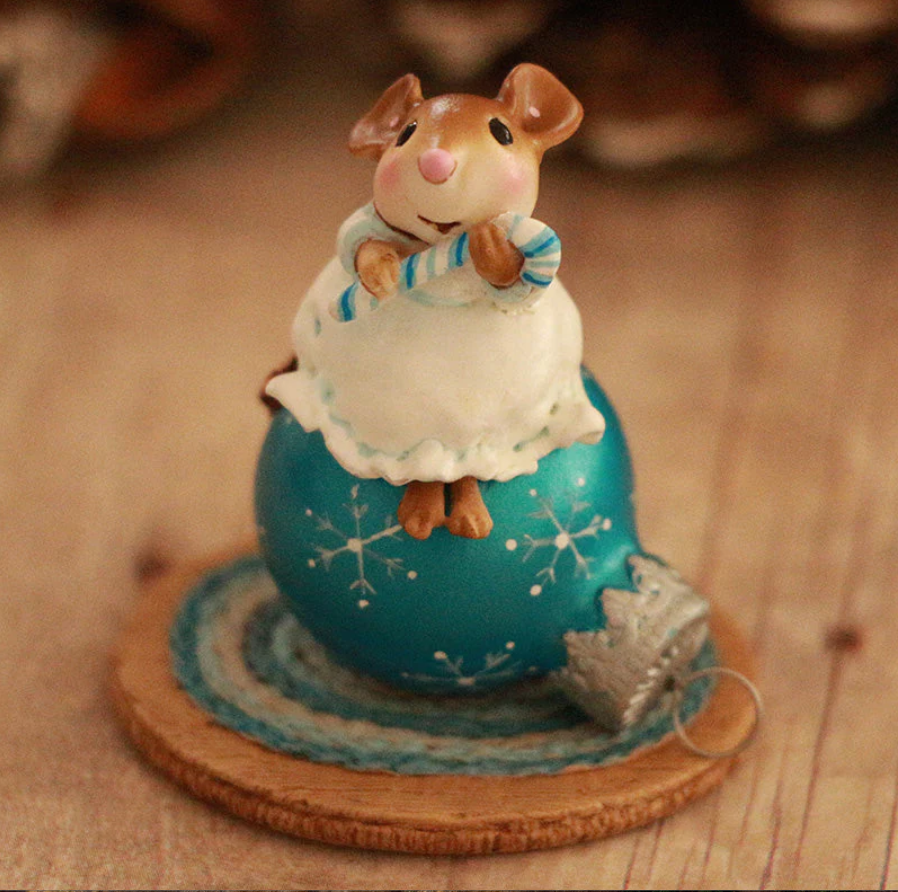 Clutching her candy cane she is perched atop a delicate and ornate holiday ornament in her night dress, smiling with the joy and excitement of the season!