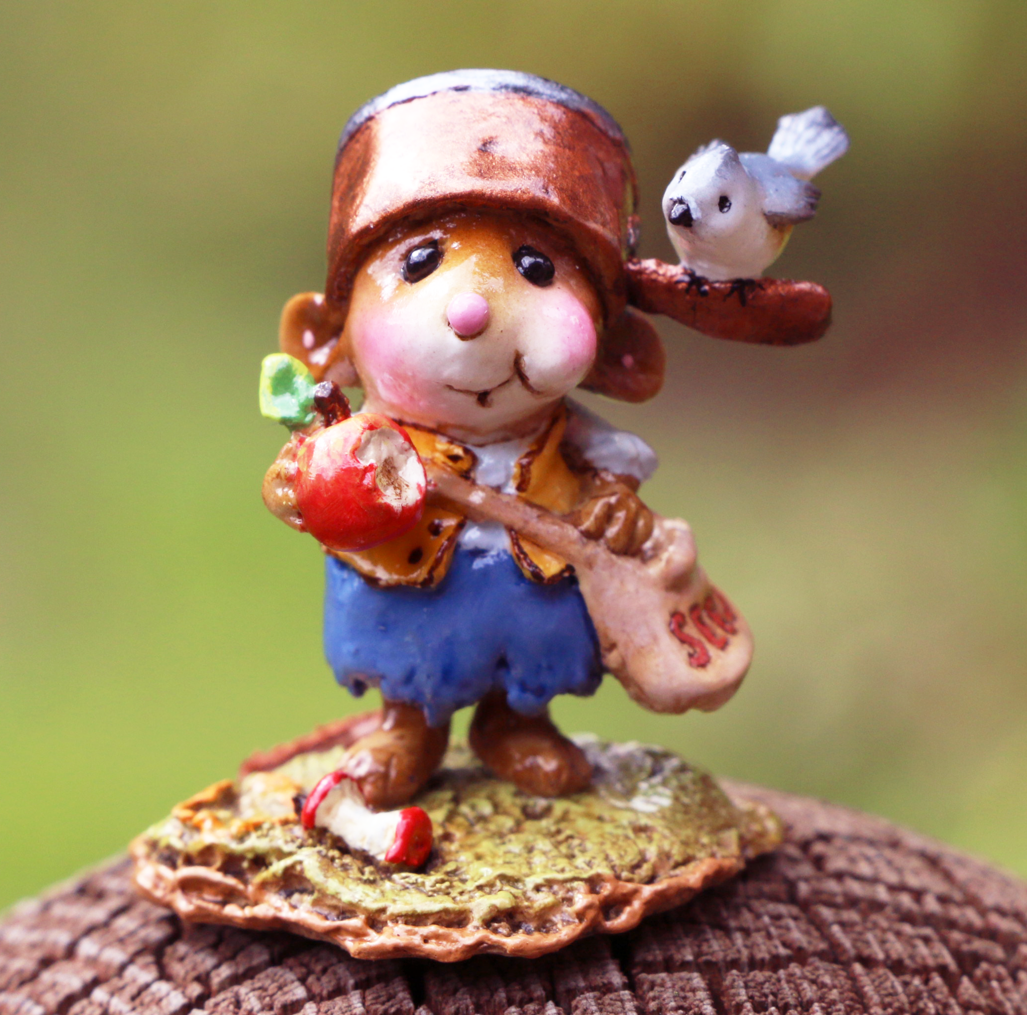 After traveling many miles and sewing many seeds, our little folk hero takes a break to enjoy the fruits of his labor. Wee Johnny thinks his apples are simply delicious! Comes in blue and green trousers.