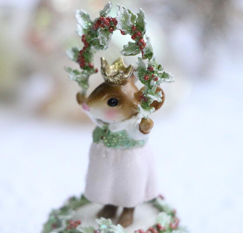 Adorned with holy leaves and berries sparkling like the morning after a fresh snow, a little girl stands on a hat box reminiscent of a vintage holiday illustration.