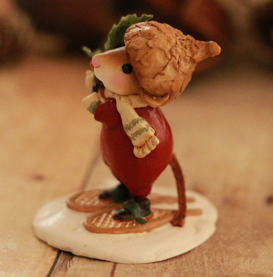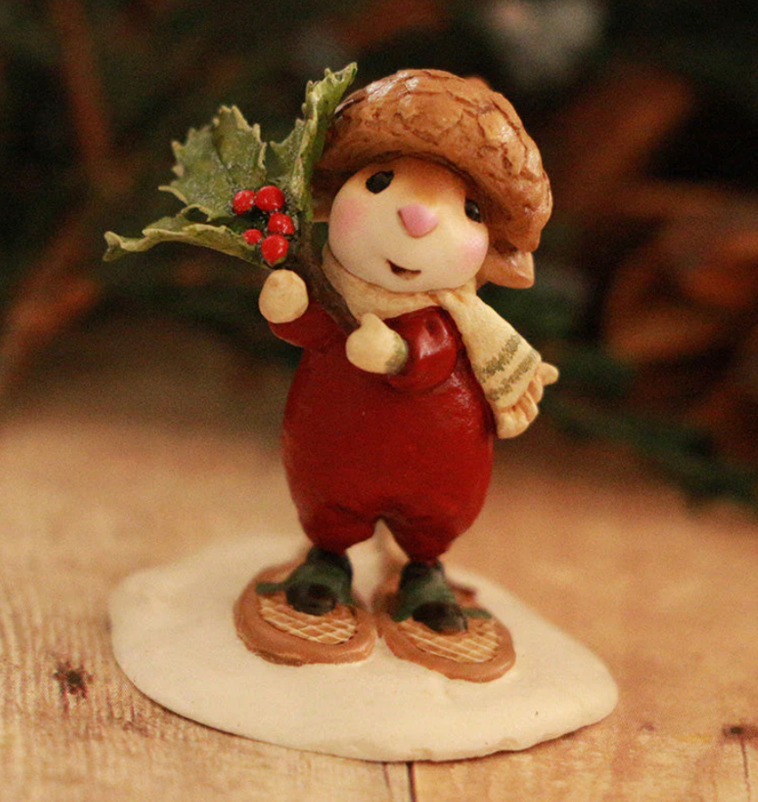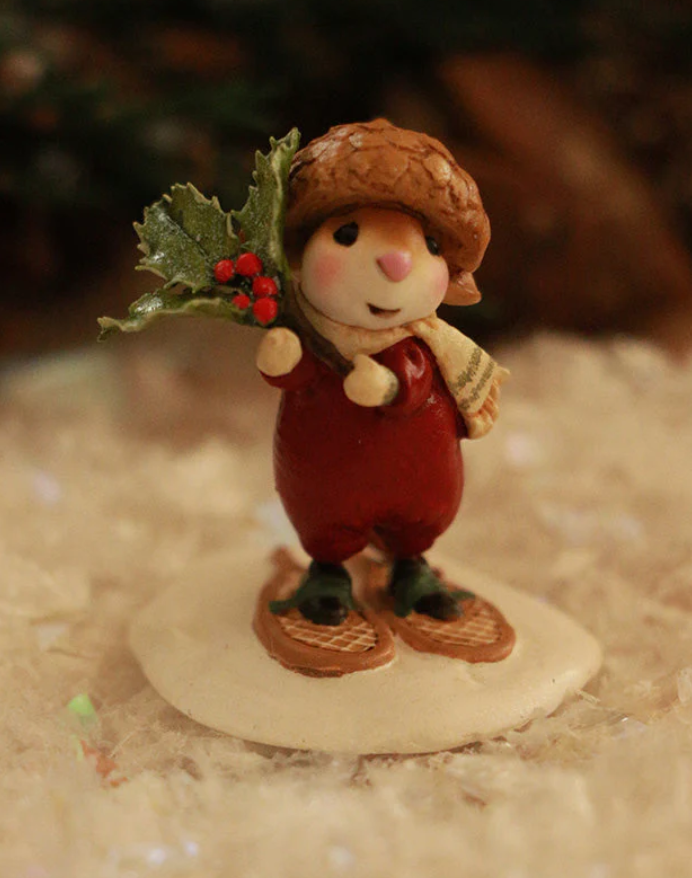 Chilly but delighted, this mouse is snowshoeing though the crisp snow holding a special sprig of holly to bring home to decorate for the holidays.