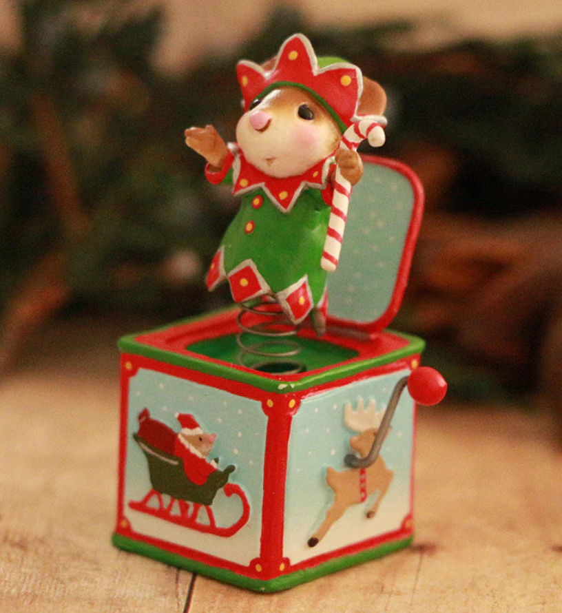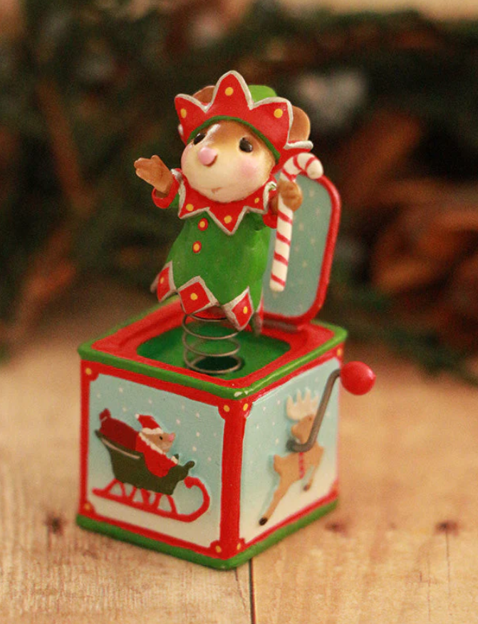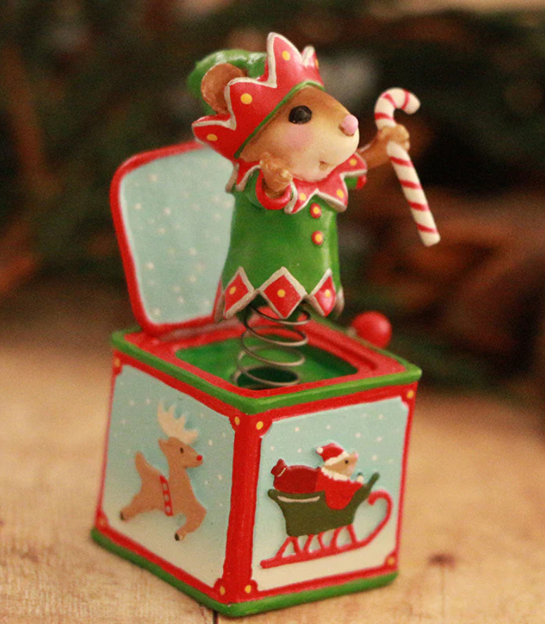 Surprise! The cutest Jack-in-the-box has sprung to life and is swaying back and forth on his real metal spring. Your eyes won’t believe what they are seeing when they look upon the tiny details in this masterpiece carefully hand painted, sculpted and constructed with tiny materials.