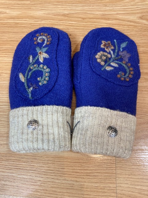 A gorgeous blue color with embroidery of light blue, oatmeal and sage, creates a lovely floral pair of Mackinac Mittens that will keep you toasty warm all winter.
