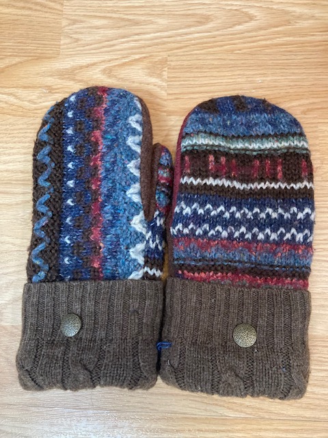 Many shades of blue, magenta and ivory form a fair isle pattern in these mittens with a pretty coffee shade on the cuff, accented with subtle button detail.