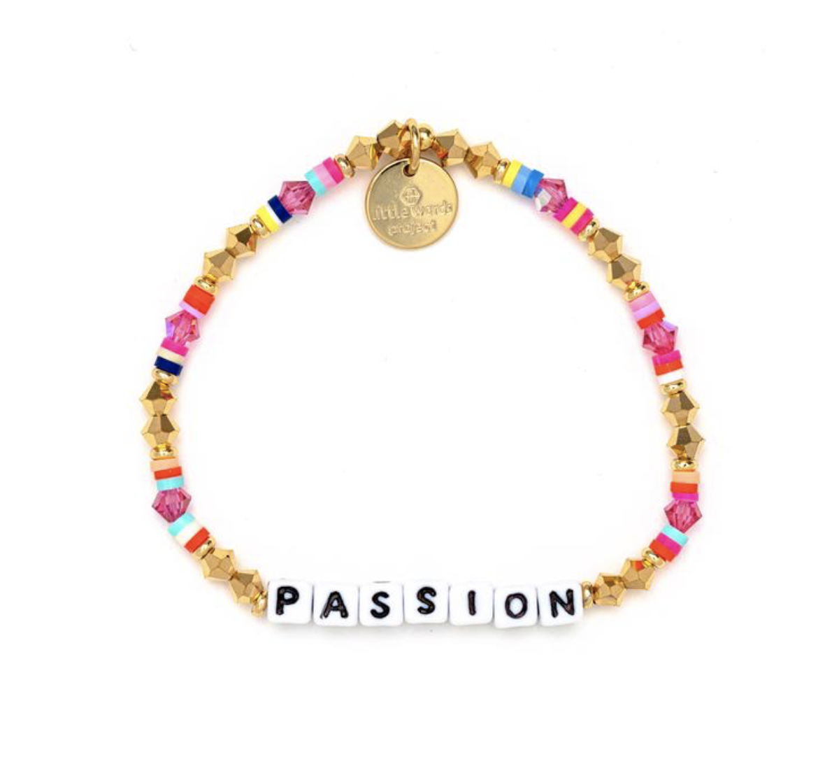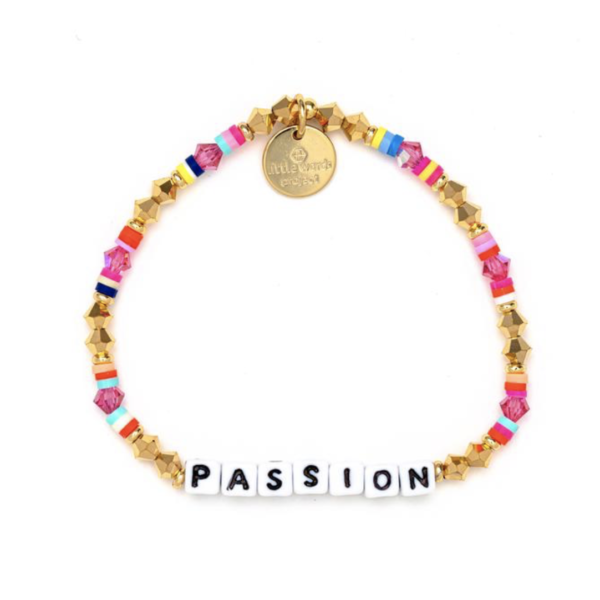 Hand-crafted, beaded bracelet Gold-plated brass hardware Elastic stretch bracelet Handle with Care – do not wet